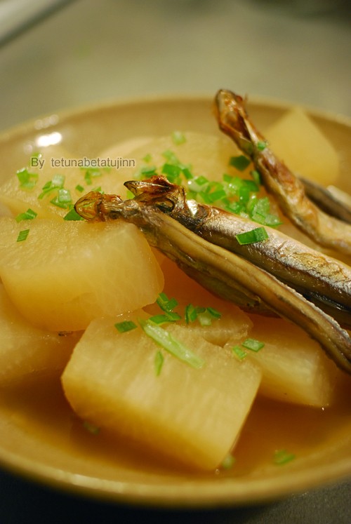 圧力鍋で茹でこぼした大根と、カリカリシシャモを醤油でコトコト。