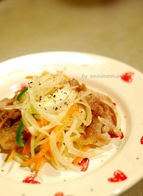 豚コマ肉の唐揚げと玉ねぎにんじんピーマンのマリネ。