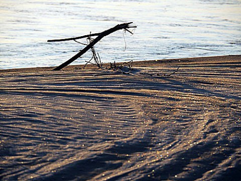川原では霜が降りて白くなった砂場が