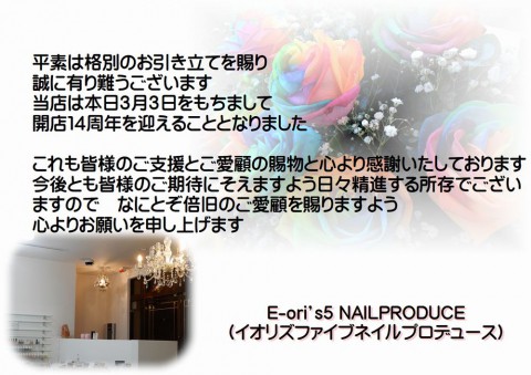 E-ori's5 NAILPRODUCE(イオリズファイブネイルプロデュース)です。