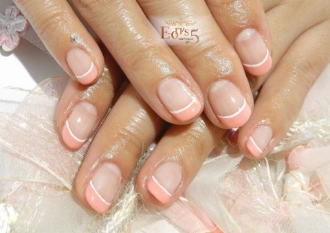 コーラルピンクのフレンチにホワイトのフレンチラインをプラスしたデザインです。