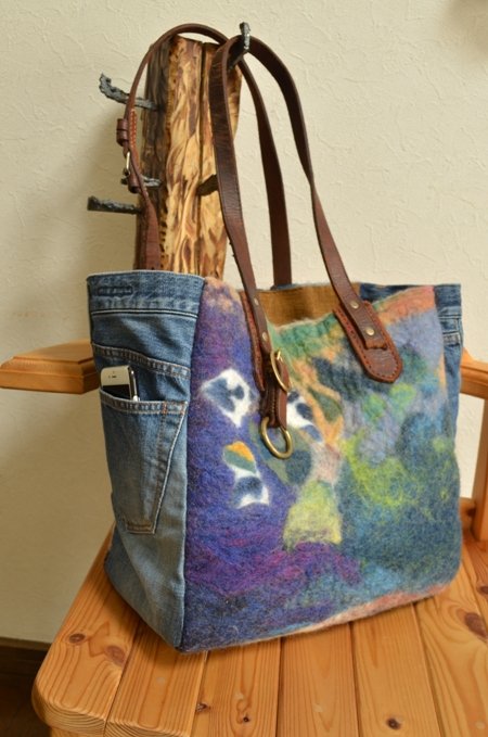 先日 作ったフェルト布を 革ベルトやジーンズとコラボして