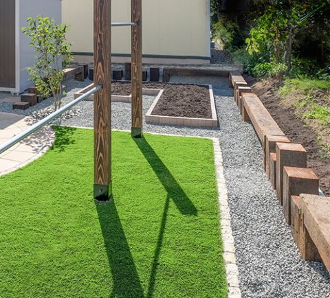 お庭の周囲をフェンスとするのではなく、枕木のステップとベンチでつないで遊びがうまれる工夫としています。