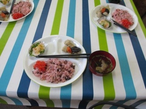 お赤飯に、煮物、えびときゅうりの酢みそ和え、そしてお吸い物☆