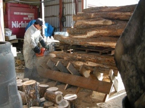 楢原木をタイヤショベルで作業台に運びます