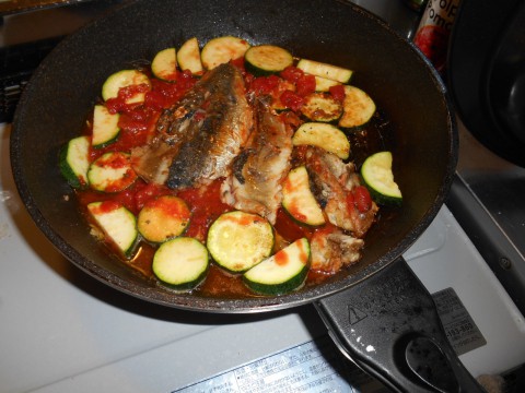 イワシはムニエル、ニンニク・ズッキの輪切り、オリーブオイルで