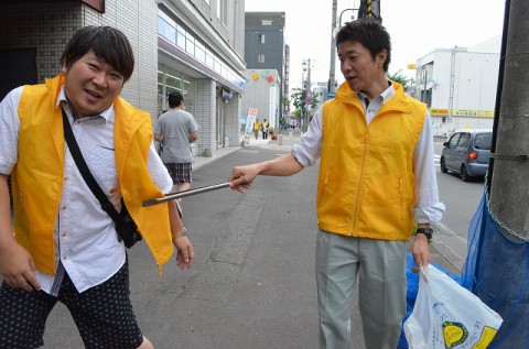 お祭り期間で人通りが多いこともあってか、中間地点でゴミがいっぱいになった袋を見せているのは、[写真右]アカデミー委員会 幹事 梶原 一生(かじわら いっしょう)君です。