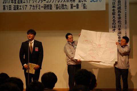 ウィンターコンファレンス2日目は道東エリアの各地青年会議所で開催した塾で、学んだことを皆さんの前で発表してもらいます。アカデミー委員会 梶原 成悟(かじわら せいご)君は地域貢献することで自分の経験値が上がったことや、自ら考えたマスコットキャラクターの話をしていました。
