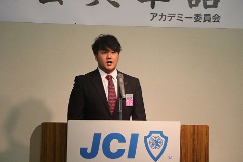副理事長 森 芳邦(もり よしくに)君。厳しいながらも愛のある講評をしていただきました。新入会員の心にその愛が深く刻み込まれたことでしょう。