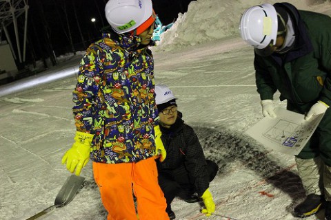 図面を見ながら、地面の雪にスプレーして回転そりや迷路の位置決めをしていますよ!