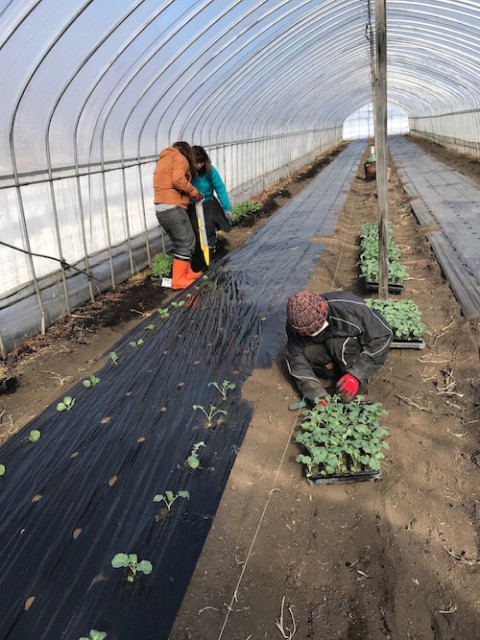 ミニブロッコリー、ミニキャベツ、ミニ白菜を、ビニールハウス内に植え替えしました。