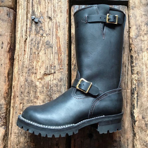 無骨でインパクトのある独特のフォルムが魅力のBOSS!! 今回は、ベースカラーBLACKにレザーライニングBLACK!! バックルはブラス製、 アウトソールは、#100 Vibram 履き込むほどに馴染み、自分の足のかたちへとフィットしていきます。