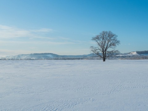 朝日に輝く”ジュエリーアイス”と霧氷の”はるにれの木”