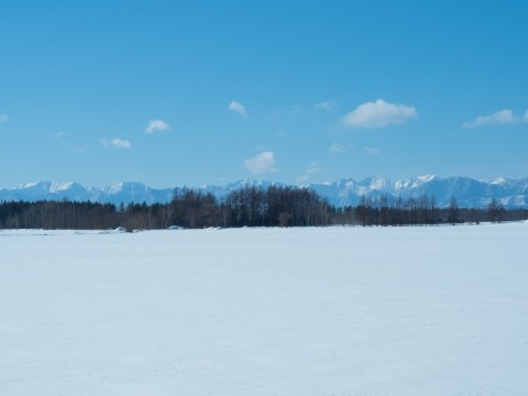 平らな雪原の先にそびえる日高山脈はインパクトがあります。