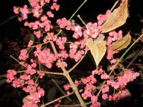 角っぽいピンク色のマユミの実も