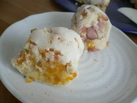 2種類の生地を流して蒸します。この日は、かぼちゃの生地と、ソーセージ&コーンの生地。