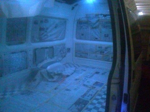 画像にも少し写っていますが、テーブルやシート、天井等々・・・既に完成されているのですが、まだ、素材のままの内張やボディー色(ホワイト)が見えている場所を無くして欲しいとのご依頼を頂きました(^_^)b
