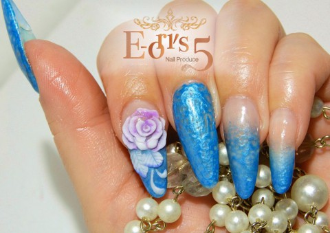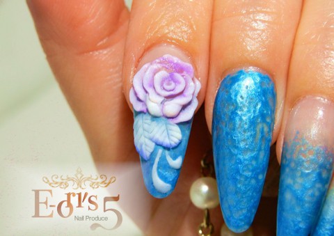 ポースリンブルーのパールの凹凸ジェルをフルコート&グラデーションにデザインした土台に、ホワイト✖パープルローズのエンボスを飾りました。