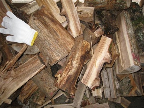 曲がっている部分や腐っている部分を玉切りして山に捨てているものを手間暇かけて山から下ろし割っています。