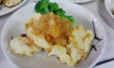 「鶏天」です。1) 鶏むね肉を削ぎ切りにします(肉の臭みが気にな...