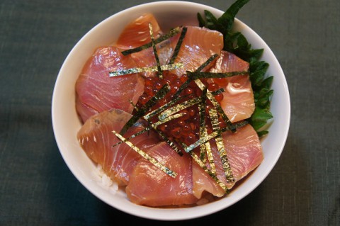 ブリ刺しが余ったのをヅケにしてあったのと、冷蔵庫のイクラを合わ...
