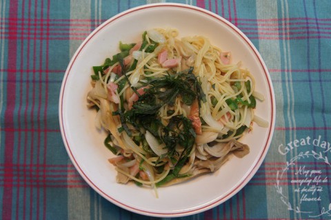 冷蔵庫に残っていたベーコンや、自宅でとれたばかりのピーマンを刻...
