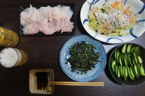 この日の肴は、白身の刺身(ヒラメだったかな?)と小松菜の胡麻和...
