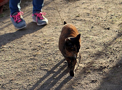 リードを付けて散歩のニャーちゃん