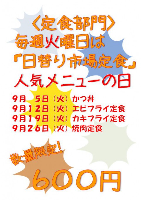 こんにちは。市場食堂ふじ膳です。明日は土曜日週末ですね。3連休の...