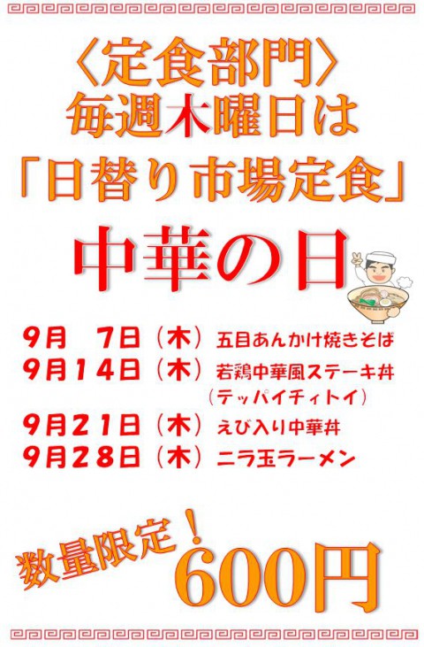 明日はお休みです。明後日(9月14日)は中華の日!