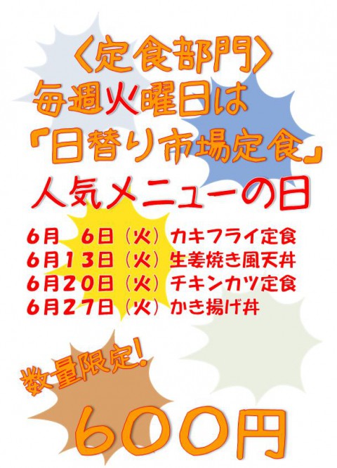 こんにちは。市場食堂ふじ膳です。今日は特別メニューが盛りだくさん...