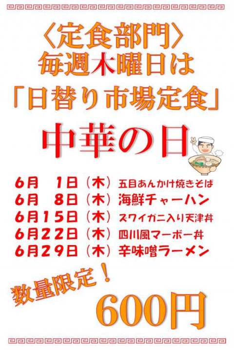 明日(6/21)はお休みです。6/22(木)は中華の日!