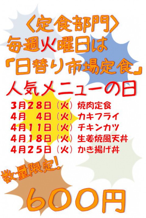 こんにちは。市場食堂ふじ膳です。ゴールデンウィーク前の1週間が始...