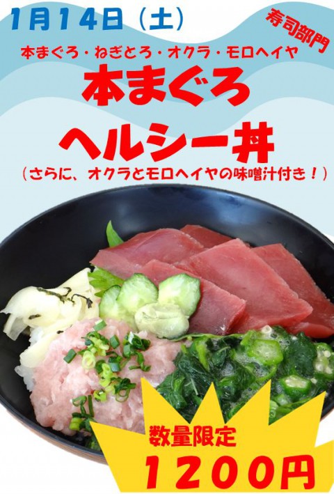 土曜日は特製天丼の日。また、明日限定で本まぐろヘルシー丼も。