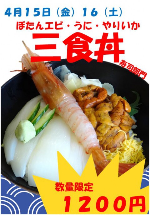 ボタンエビ・うに・やりいかの三食丼。