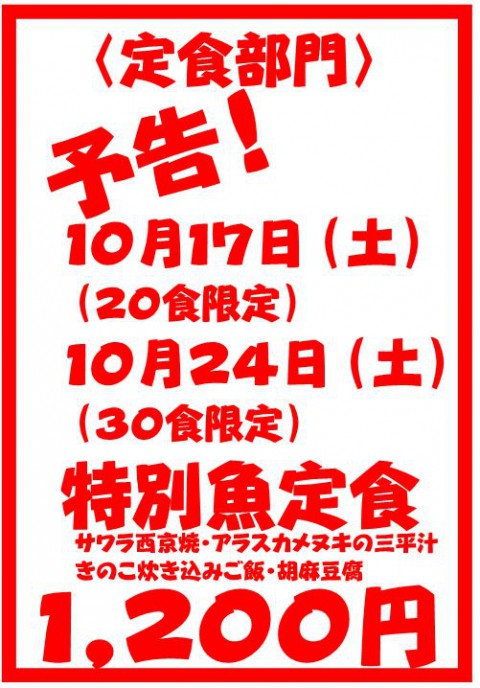 予告! 特別魚定食。 焼き魚に加え、メヌキの三平汁や焼きこみご飯も!