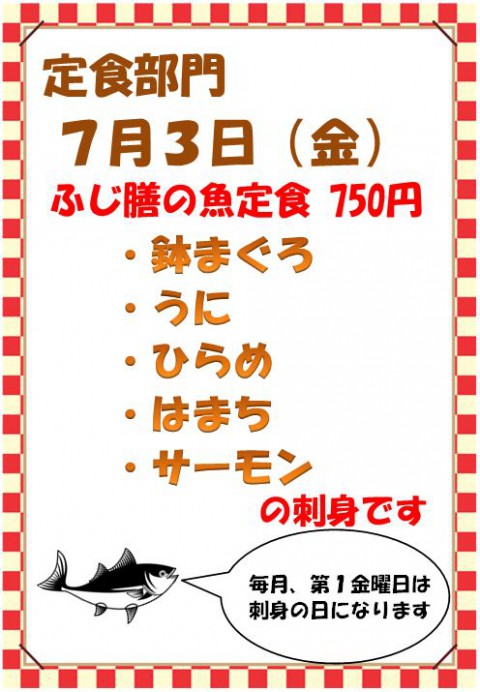 こんにちは。市場食堂ふじ膳です。今日で6月も終わりですね。6月の...