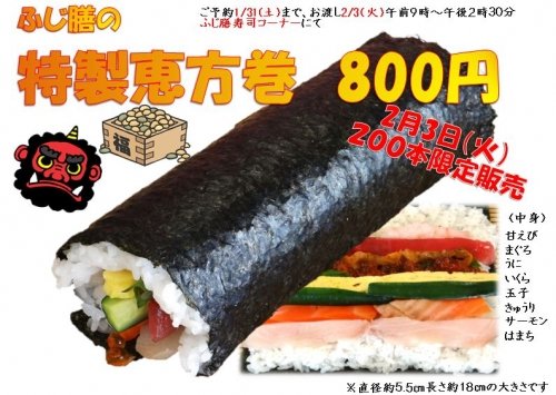 ふじ膳特製、恵方巻ですよっ! 200本限定、 800円!