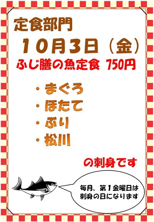 こんにちは。市場食堂ふじ膳です。明日は10月最初の金曜日。月に1...