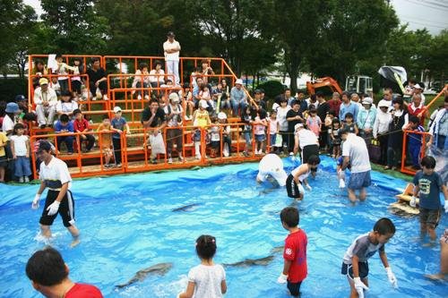 市場祭りの人気イベント。サケのつかみ取り!!