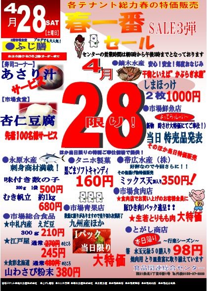 こんにちは。市場食堂ふじ膳です。さて、来週末の4月28日(土)は...