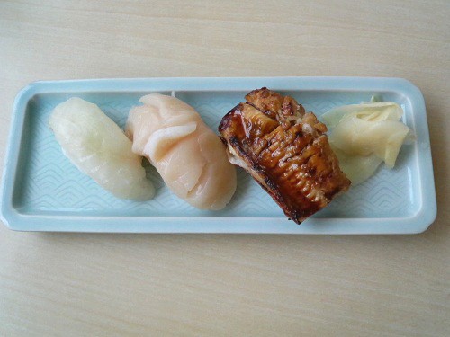今日の握り3カンの写真です!!”ひらめ、ほたて、穴子”で300円...