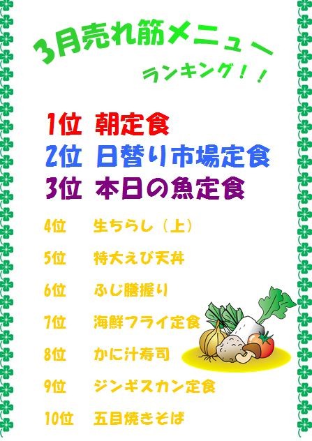 お世話さまでーす!市場食堂ふじ膳です。今日は3月のメニューランキ...