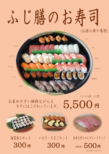 こんにちは。市場食堂ふじ膳です。ふじ膳のお寿司をもっとたくさんの...