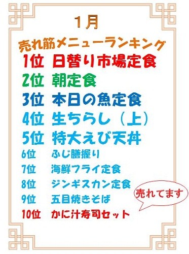こんばんわ。市場食堂ふじ膳です。きょうは、1月の売れ筋ランキング...