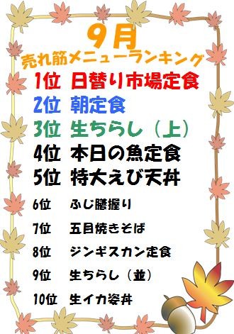 こんにちは!!市場食堂ふじ膳です。さて、今日はさっそく”9月売れ...