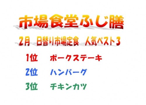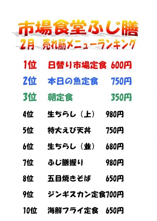 まいどさまでーす。市場食堂ふじ膳です。今日の画像は「2月のランキ...