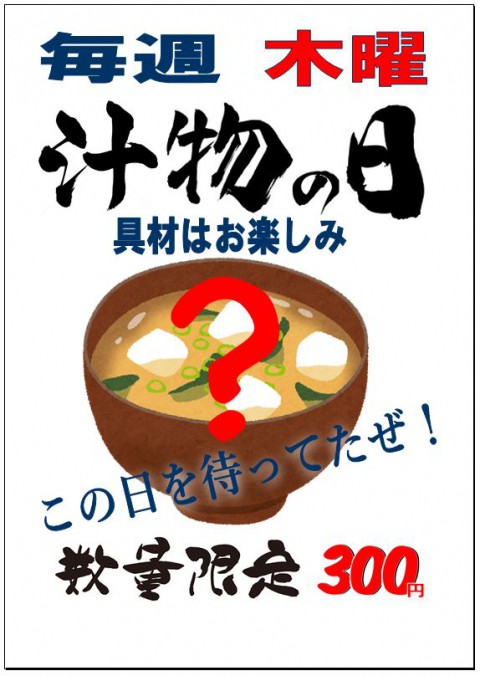 明日はお休みです。明後日(木)の限定汁物は「サーモン三平汁」