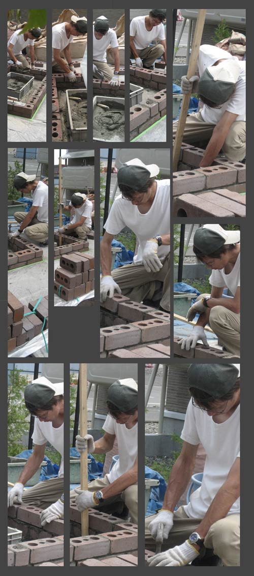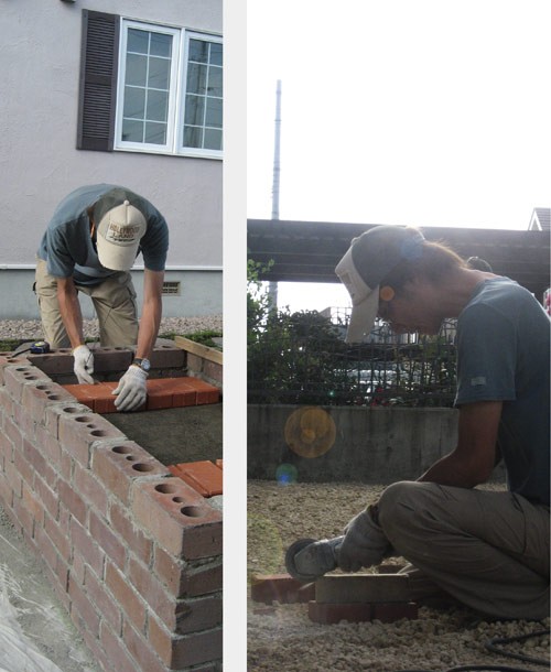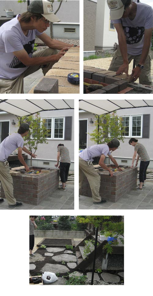 ご主人による煉瓦テーブル作成の最終日です。奥様もお手伝い。とって...