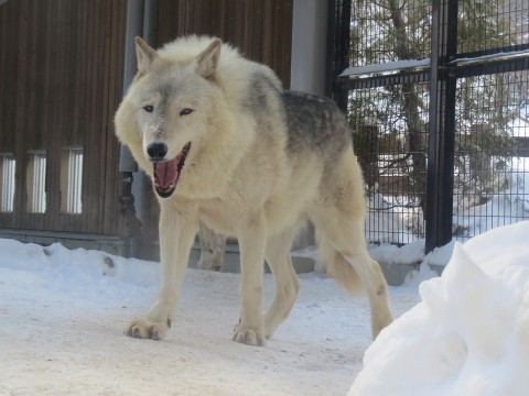 モートへ滑り降りる遊びを楽しんでいたリラ。除雪機が気になりじっと...